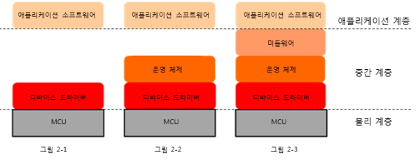 일부는 제품에 OS를 적용하기도 하는데 이것은 모든 신제품의 OS 상에서 구동되는 애플리케이션 소프트웨어 데이터를 다시 활용하기 위해서이다. 이러한 경우 모든 신제품에 같은 OS를 인스톨하여 MCU가 기존 자산을 사용할 수 있고 기능을 변경하거나 추가할 수도 있다. 그림 2-2와 같이 이러한 경우에는 하드웨어, 디바이스 드라이버, OS, 애플리케이션 소프트웨어 등 4개의 계층으로 구성된 소프트웨어 구조를 사용한다.