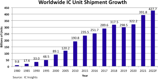 유닛 기준으로 2022년 반도체 출하량은 2000년 대비 약 5배, 1980년 대비 44배가 넘는 4,277억 유닛으로 사상 최고 수준에 다다를 것으로 예상했다.