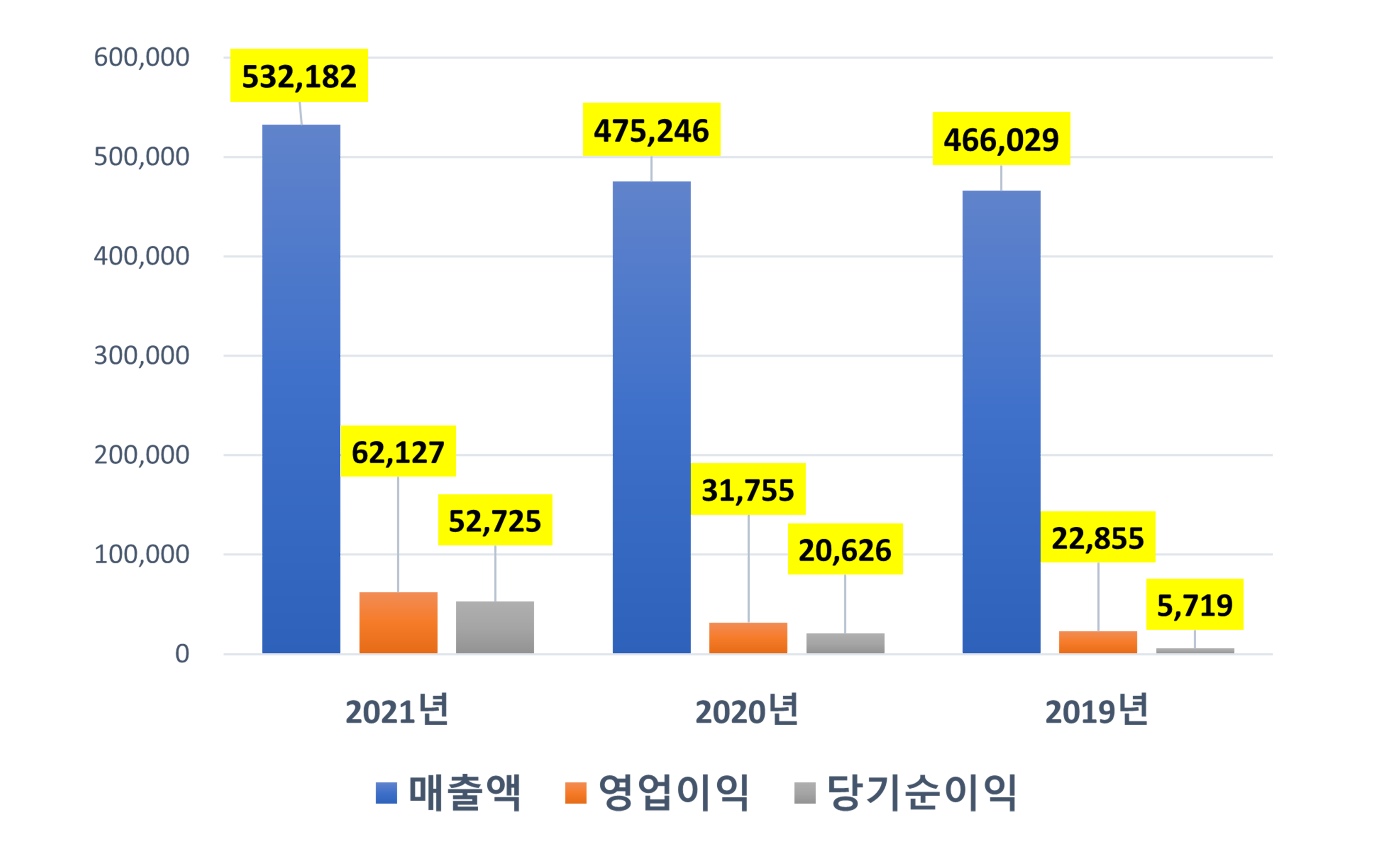이러한 반도체 소재 51社의 2021년 매출은 53조2,182억원을 기록해 전년대비 12% 증가했고, 최근 연평균 7%의 성장을 지속하고 있다. 영업이익은 6조2,127억원을 기록해 전년대비 96% 증가했고, 당기순이익은 5조2,725억원을 기록해 전년대비 156% 증가했다.