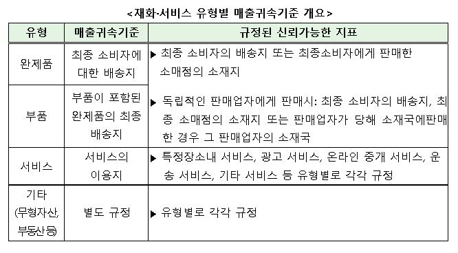 재화·서비스 등 유형별 매출귀속 기준을 보면 완제품 및 부품은 최종 소비자의 배송지 혹은 최종 소비자에게 판매한 소매점의 소재지를 지표로 삼는다. 예컨대 한국에서 생산된 반도체가 중국에서 제품으로 조립·생산돼 미국으로 건너가 최종소비자에게 판매됐을 경우, 한국의 반도체 기업은 미국에 매출이 귀속된다.