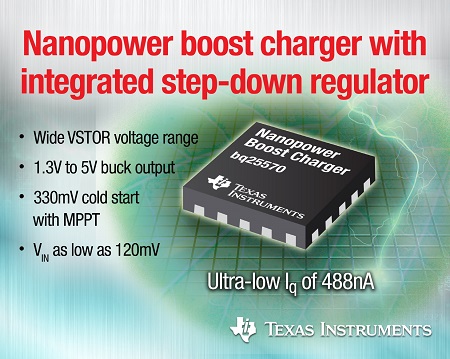 TI는 선도적인 전원 관리 IC 및 MCU 공급업체로 고효율, 최저전력 소비로 주변 에너지를 추출하고 관리하는 혁신적인 디바이스를 연이어 출시하며 차세대 초저전력 설계를 이끌고 있다. 2011년 TI는 330nA의 낮은 대기 전류의 bq25504 부스트 충전기 회로를 출시 한 바 있으며, 이 밖에도 모든 저전압, 저전력 설계 요건을 지원하는 부스트 컨버터, 벅 컨버터 및 배터리 충전기를 공급하고 있다.