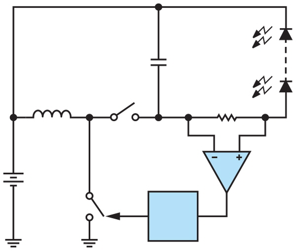 스텝업(부스트) LED 드라이버는 총 LED 스트링 전압보다 낮은 전압을 사용해서 LED 스트링 전류를 레귤레이트한다. 이 토폴로지는 다수의 LED를 단일 스트링으로 전도해야 하는 경우에 유용하다. 통상적인 12V 차량용 시스템은 6V∼18V까지 범위에서 동작하므로, LED 드라이버가 최저 6V까지 동작해야 하고 높은 스텝업 비율을 제공해야 한다. 그림 3과 그림 4의 회로 예시는 컨트롤러가 상측 스위치를 변조해서 전류 제어를 하는 시스템 다이어그램을 보여준다.