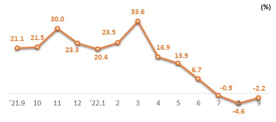 2022년 9월 ICT 수출액이 6월 이후 3개월 만에 200억불을 상회한 208.6억불을 기록해 전체 수출 내 30% 이상 비중을 차지했다.
