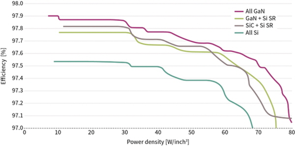 그림 4에서는 54V 출력으로 7kW를 제공하는 각기 다른 서버 전원장치의 효율과 전력 밀도를 보여준다. 전부 GaN을 사용한 디자인이 효율과 전력 밀도 둘 다에 있어서 가장 우수하다는 것을 알 수 있다.