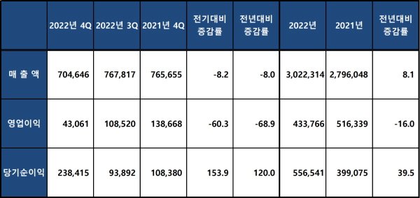 ▲삼성전자 2022년 4분기 및 연간 경영실적(단위 : 억원, 연결재무제표 기준)