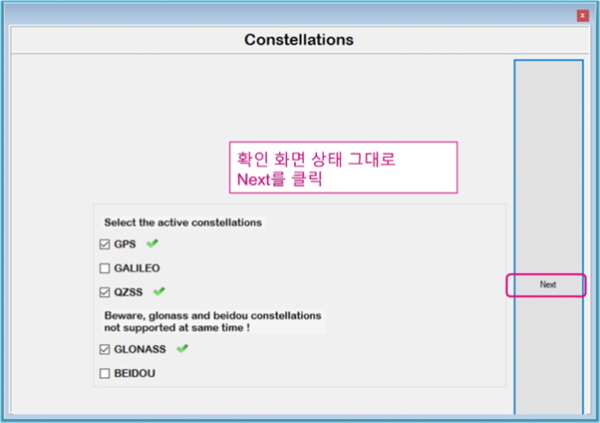 그 다음, ‘QZSS constellation used for fix’에 체크한 후, Next를 클릭한다.