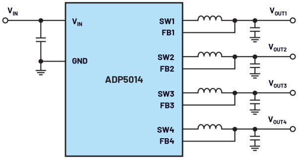 ▲그림 1 : DC-DC 컨버터의 사례로서, ADP5014는 하나의 입력 전압을 사용해서 최대 4개의 출력 전압을 제공한다.(개략도)