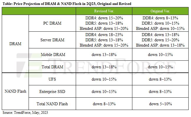 9일 시장조사기관 트렌드포스에 따르면 2023년 2분기 D램과 낸드플래시 가격은 서버 출하 부진과 높은 재고 수준으로 인해 기존 전망을 상회해 일부제품에서 ASP가 추가로 하락할 것이라고 밝혔다.