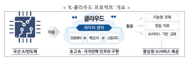 정부는 국산 AI반도체 및 클라우드 경쟁력을 키우기 위해 ‘K-클라우드 프로젝트’ 1단계에 본격 착수한다. 'K-클라우드 프로젝트’는 엔비디아, AMD, MS, 아마존 등 글로벌 빅테크가 주목하는 AI반도체 개발 시장에 뛰어들기 위해 국산 AI반도체를 개발하고, 이를 데이터센터에 적용해 국내 클라우드 경쟁력을 강화하기 위한 정책이다.
