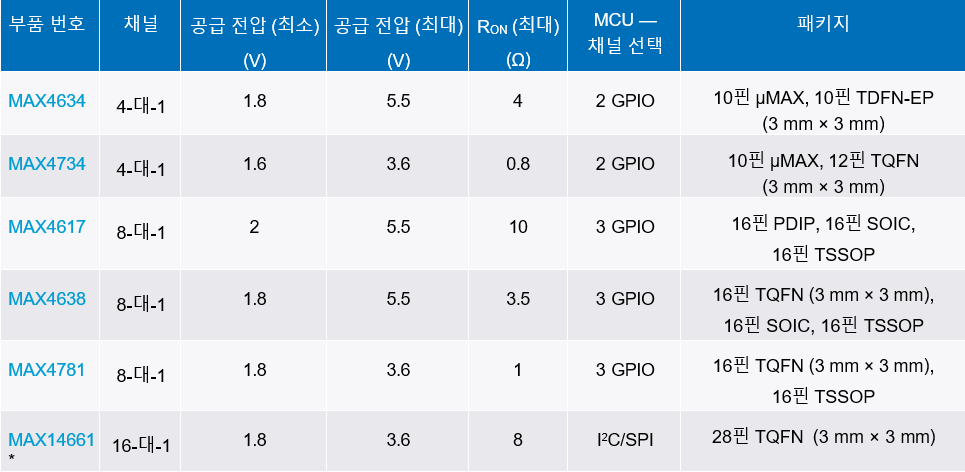 ▲표 1 : 1-와이어용 아날로그 MUX 선택 가이드