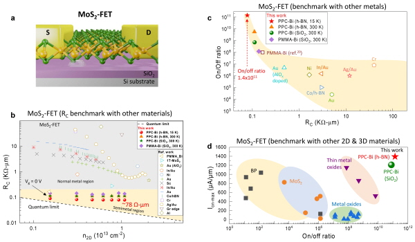 연구진이 제작한 MoS2 FET 소자는 양자 한계에 근접한 78Ω-μm의 작은 옴접촉저항과 1011 이하의 큰 전류 온/오프 비 전류 on/off 비, 1.4mA/μm 이하의 최대전류 최대 전류 값을 나타내는 등 지금까지 개발된 어떤 소자보다 뛰어난 성능을 보였다.