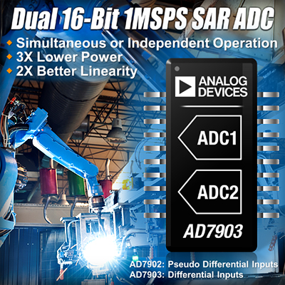 2014년 5월 8일 – 신호 처리 애플리케이션용 고성능 반도체 분야 글로벌 선도 기업인 아나로그디바이스(www.analog.com, NASDAQ: ADI)는 의사 차동(pseudo differential)과 차동 입력 옵션을 각각 갖춘 16비트 1MSPS A/D 컨버터 2종을 출시한다. AD7902 듀얼 의사 차동, AD7903 듀얼 차동 컨버터 2종 모두 16비트 1MSPS PulSAR® A/D 컨버터로 동시 및 독립 신호 체인 구현이 가능해 하나의 패키지에서 두 가지 샘플링 솔루션을 제공한다. 신규 출시된 A/D 컨버터는 각각 1MSPS에서 12mW의 전력을 소비하며 이는 경쟁 제품에 비해 70% 낮은 수준이다. 전력 소비는 고밀도 데이터 수집 시스템의 설계 특성상 열방출 문제를 해결하는 쓰루풋 속도에 따라 달라진다. 이 2종의 A/D 컨버터는 뛰어난 정확도, 정밀도를 위해 최대 +/-0.5LSB, 94dB SNR기능을 보유하여 광범위한 산업 및 계측 애플리케이션에 사용 될 수 있다.