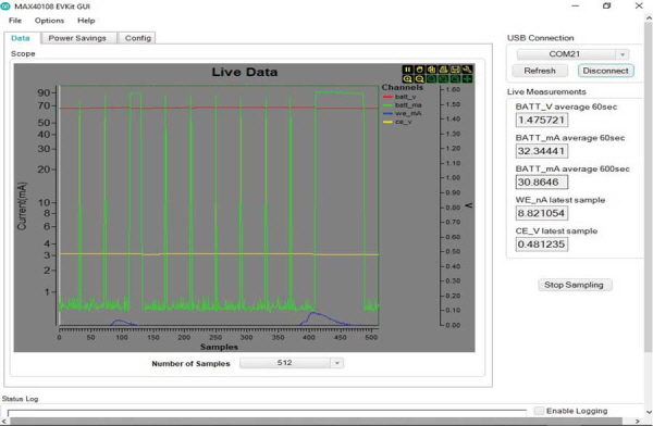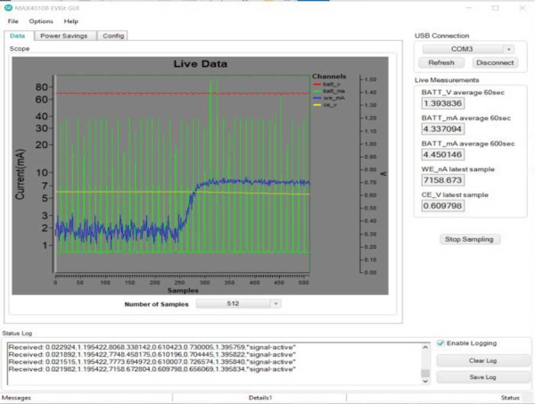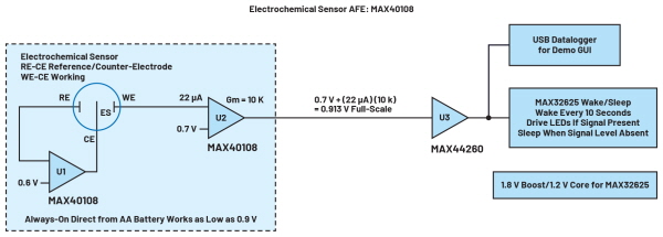 이 시스템은 저전압 연산 증폭기가 1.5V AA/AAA 배터리로 동작해서 전기화학식 센서로 바이어스 전류를 공급하고, 시스템의 나머지 부분은 슬립 모드로 전환해서 전력 소모를 절약하도록 한다.