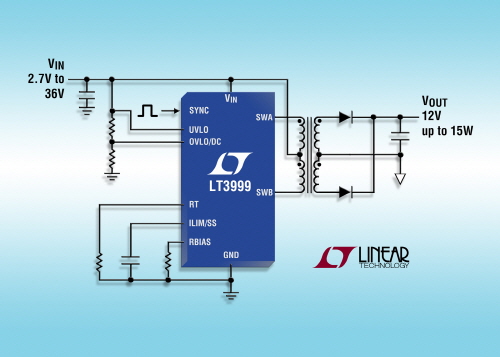 2014년 9월 23일 – 리니어 테크놀로지 코리아(대표 홍사곽, www.linear.com)는 1A 전류 제한 전력 스위치 2개를 갖춘 모놀리식 푸쉬풀 절연형 DC/DC 트랜스포머 드라이버(제품명: LT3999)를 출시했다고 밝혔다. LT3999는 2.7V ~ 36V의 입력 전압 범위에서 동작하며, 최고 15W의 전력 레벨을 타깃으로 광범위한 범위의 출력 전압을 생성할 수 있다. 이 제품은 자동차, 산업용, 의료, 군사용 애플리케이션에 적합하다.