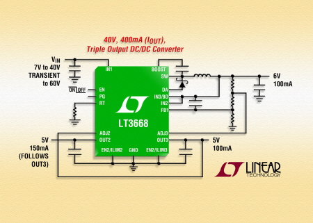 2014년 10월 21일 – 리니어 테크놀로지 코리아(대표 홍사곽, www.linear.com)는 MSOP-16E 패키지로 제공되는 듀얼 트랙킹 LDO 출력 기능을 갖춘 400mA, 40V 스텝다운 스위칭 레귤레이터(제품명: LT3668)를 출시한다고 밝혔다. LT3668은 전력 공급장치의 측정 ASIC을 꼼꼼하게 추적하는 센서의 전원 공급장치가 필요한 애플리케이션에 적합한 완벽하고 견고한 전력 솔루션이다. LT3668은 60V까지 과도상태를 보호하며4.3V ~ 40V의 VIN 범위에서 동작하는 특성으로 자동차 및 산업용 애플리케이션에 이상적이다. 이 제품의 내부 600mA 스위치는 최고 400mA까지 제공할 수 있으며, 1차 출력의 혼합 부하와 트랙킹 LDO 두 개 모두에 배전된다. 1차 스위칭 채널은 1.2V로 낮은 출력을 제공할 수 있으며, 각 LDO는 1.1V로 낮은 출력을 제공할 수 있다. LT3668은 3개의 모든 채널이 조절될 때, 대기 전류가 50µA에 불과하며, 항상 전원이 켜져야 하는(always-on) 자동차 애플리케이션에 이상적이다.