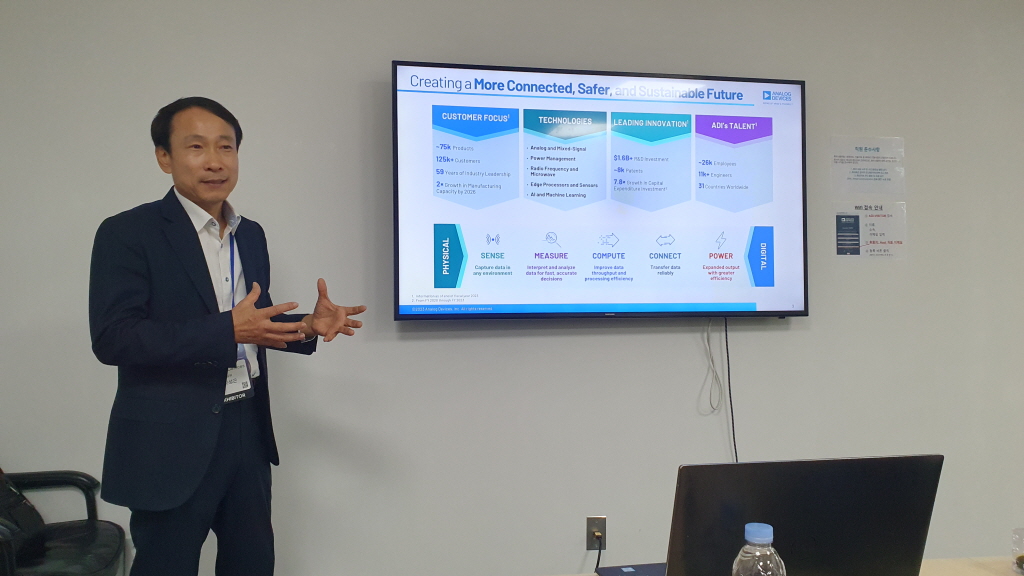 이날 설명을 담당한 ADI의 차성근 상무는 ADI는 물리적인 것들을 디지털화 한다는 기치로 제품 개발 및 공급에 나서고 있고, 디지털화를 위해서는 센싱, 측정, 연산, 통신, 파워가 필수적으로 필요하기 때문에 관련 제품을 유통하고 있다고 말했다.