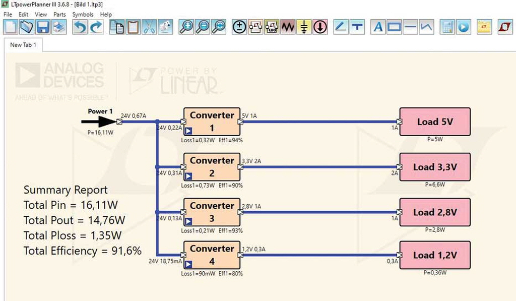 ADI의 LTpowerPlanner는 이를 위한 유용한 도구를 제공한다. 이 도구는 다양한 구성들로 전력 트리를 도식화하고, 그것들을 비교하는 데 사용될 수 있다.