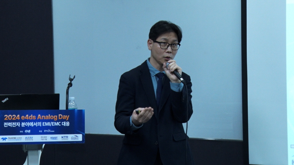 ▲연규봉 한국자동차연구원 수석연구원이 ‘2024 e4ds Analog Day’에서 ‘전기차 등 전장부품에서의 전자파 간섭문제와 EMI 차폐’를 주제로 발표하고 있다.