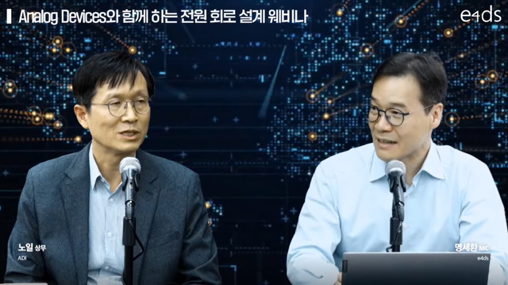▲(왼쪽부터)노일 ADI 상무와 명세환 e4ds MC가 ‘Analog Devices와 함께 하는 전원 회로 설계 웨비나’를 진행하고 있다.