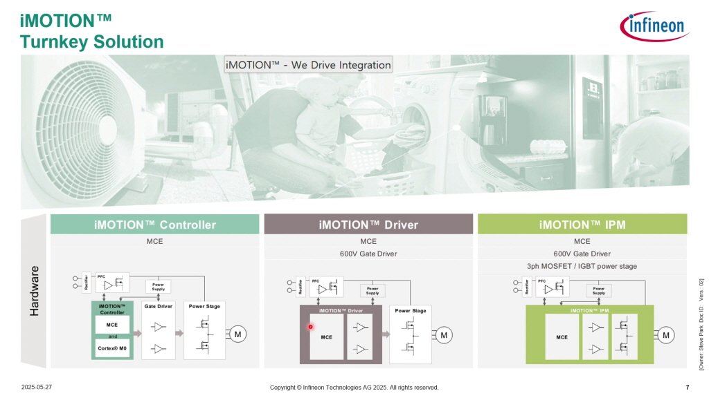 아이모션 제품은 기본적으로 아이모션 컨트롤러, 게이트 드라이브 통합형, 나아가 IGBT나 MOSFET을 내장한 원칩 IPM 형태 등 세 가지 라인업으로 구성된다.