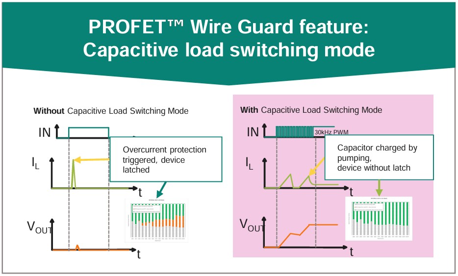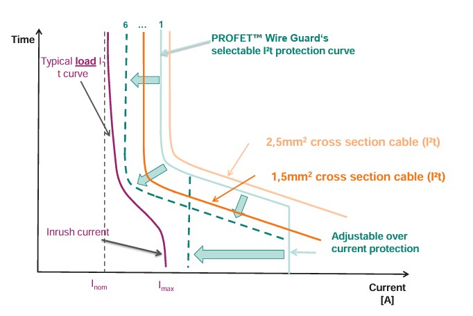PROFET™ Wire Guard는 기존 PROFET 시리즈와 비교해 기술적 진보가 분명하다. 가장 두드러지는 차별점은 I²t 보호 특성의 지원이다. 이 기술은 전류의 크기와 흐른 시간을 함께 고려해 과전류 차단 조건을 설정할 수 있도록 한다. 이를 통해 기존 퓨즈의 용단 특성과 유사한 보호 곡선을 전자적으로 구현할 수 있으며, 다양한 와이어 사양에 맞게 유연하게 적용 가능하다.