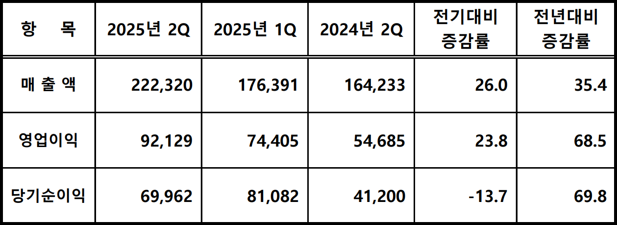 SK하이닉스는 24일 공시를 통해 2025년 2분기 경영실적을 발표했다. 이에 따르면 회사는 연결재무제표 기준으로 매출 22조2,320억원을 기록해 전년동기대비 35.4% 증가했고, 영업이익은 9조2,129억원(영업이익률 41%)으로 전년동기대비 68.5% 증가했다. 당기순이익은 6조9,962억원(순이익률 31%)으로 전년동기대비 69.8% 증가했다.