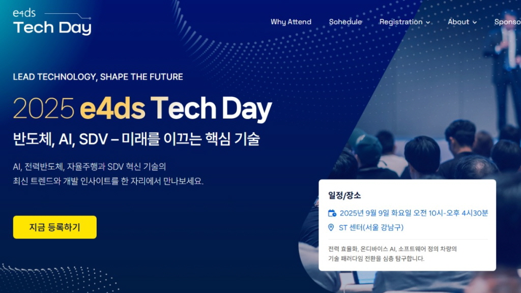 e4ds news는 오는 9월9일 화요일 서울 강남구 ST센터(서울시 강남구 테헤란로 7길 22(역삼동 635-4) 한국과학기술회관 1관 지하1층)에서 ‘2025 e4ds Tech Day’를 개최한다. 이번 컨퍼런스는 ‘반도체를 중심으로 한 전력 효율화, AI 및 자동차 기술의 미래와 변화’라는 주제로 반도체 기술 혁신에서부터 온디바이스 AI, 자율주행 및 소프트웨어 정의 차량(SDV)까지 차세대 기술 트렌드를 살펴본다. 이번 행사는 텍사스 인스트루먼트(TI), ST마이크로일렉트로닉스, MDS테크, QNX, 텍트로닉스, 마우저 일렉트로닉스, 디지키, 아나로그디바이스(ADI), NI, 벡터코리아(vector), 에티포스, 인피니언, 아성코리아가 후원한다.