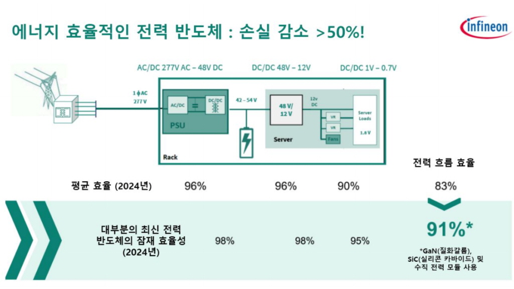 인피니언은 각 단계별 변환 효율을 최대 98%로 끌어올리는 SiC(실리콘 카바이드)·GaN(질화갈륨) 기반 광대역갭(WBG) 반도체와 첨단 패키징 기술로 에너지 손실을 절반가량 줄였다.
