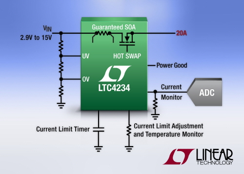삽입할 경우, LTC4234는 출력을 소프트스타트 하기 전에 커넥터 접촉 바운스가 끝내는 것을 기다린다. 부하 전류에 비례하는 그라운드 레퍼런스 신호는 외부 ADC(analog-to-digital converter)로 모니터되어 제공된다. 전류 제한은 단일 저항으로 22.5A 디폴트로 감소될 수 있다. 더 높은 전류 애플리케이션을 위해, 2개의 LTC4234는 40A 솔루션으로 쉽게 병렬화된다. 과전류 조건 동안, 컨트롤러는 조절 가능한 타임아웃 주기(timeout period) 동안 폴드백(fold back)전류 제한을 이용하여 MOSFET 전력 소비를 제한시킨다. 저전압과 과전압 임계값은 검증 윈도우 외부에서 전압이 다운스트림 부하가 되는 것을 보호하여, 회로 불량 및 손상을 방지한다.
