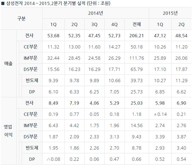 삼성전자는 매출 48.54조원, 영업이익 6.9조원의 2015년 2분기 실적을 발표했다. 매출은 전분기 47.12조원 대비 약 3% 증가했고, 영업이익은 전분기 5.98조원 대비 약 15% 증가했다.