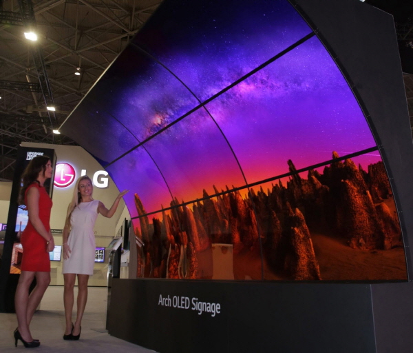 물결 형태로 휘어진 화면을 이어 붙인 사이니지, 위아래로 구부러진 사이니지 등 기존에 볼 수 없었던 형태의 제품들도 주목을 받았다. 올레드는 기존까지 주로 사용하던 LCD 패널에 비하면 두께가 얇고 곡면 형태의 조형물 제작이 가능하다.