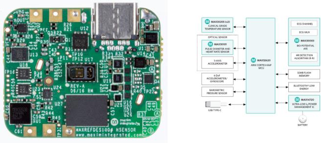 맥심 h센서 플랫폼은 초저전력 단일 채널 집적 생체전위(biopotential) AFE ‘MAX30003’ 고감도 산소 포화도 및 심박수 측정 센서 ‘MAX30101’ 임상급 온도 센서 ‘MAX30205’ 최저 대기 전류 전력관리반도체(PMIC) ‘MAX14720’ 제품과 함께 관성 센서(3축 가속도계 6축 가속도계/자이로스코프) 대기압 센서 플래시 메모리 저전력 블루투스(BLE) 등을 초소형(25.4mm x 30.5mm)으로 제공한다.