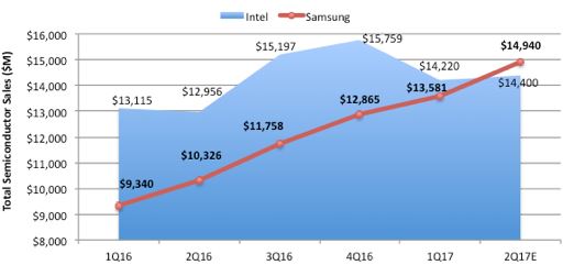 삼성이 1위를 하기 위해선 2분기 메모리 가격이 현 상태를 지속하거나 상승세를 유지해야 한다고 IC인사이츠는 전제 조건을 달았다. 이 기관이 예상한 인텔의 2분기 매출은 144억 달러(약 16조4000억 원)이며 삼성전자는 149억4000만 달러(약 17조400억원)이다. 이에 따라 삼성은 7.5% 성장한 반면에 인텔은 소폭 상승에 그치게 되었다. 1분기까지 삼성은 135억 달러의 매출로 인텔의 매출(142억 달러)에 육박했었다.