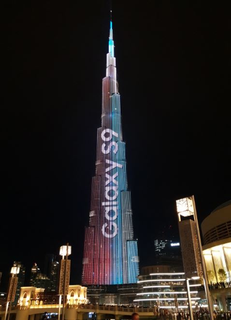 삼성전자가 현지시간 3월 2일부터 아랍에미리트 두바이에 있는 최고층 빌딩 부르즈 칼리파에 초대형 '갤럭시 S9'과 '갤럭시S9+' 출시 광고를 진행했다.