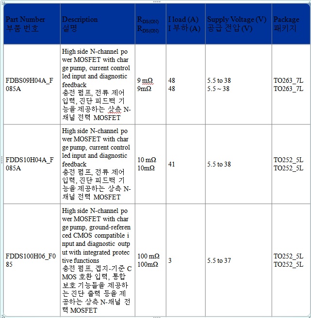 FDDS100H06_F085, FDBS09H04A_F085A, FDDS10H04_F085A 등은 AEC 차량 표준 인증을 획득했으며, 전류 제한, 단락회로 보호, 초저 대기전력, ESD 보호 기능 등도 제공한다. 디바이스는 또한 최적화된 상태 전자기 호환성을 제공한다.
