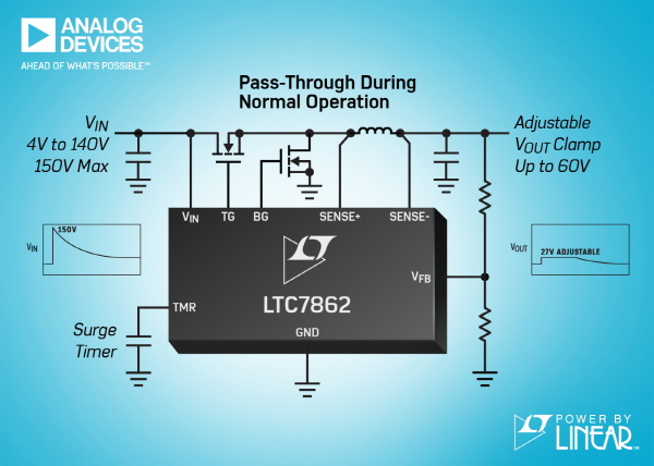 LTC7862는 4V~140V(최대 150V abs)의 입력 전압 범위에서 동작한다. 외장형 고장 타이머 커패시터(capacitor, 축전기)를 사용하면 과전압 모드에서 소비되는 시간 제한을 설정할 수 있어, 전력 손실이 최고 수준에 도달했을 때 스위칭 서지 스토퍼를 안전한 최대 동작 온도 범위 이하로 유지할 수 있다. 고장 타이머는 과전압 트랜션트나 고장 상태보다 일반적인 동작 모드에 맞게 부품 선택을 최적화할 수 있도록 함으로써 시스템 비용과 크기를 줄인다.