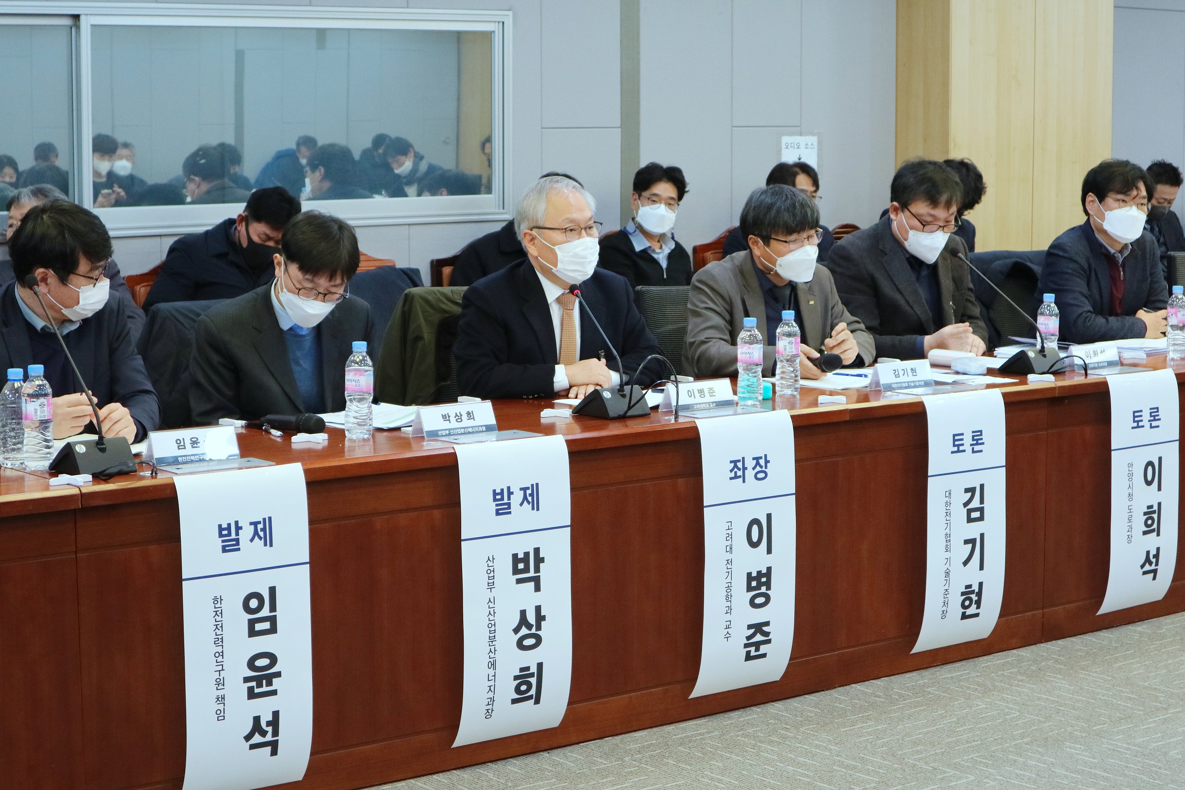▲토론회를 진행하는 좌장 이병준 고려대 전기전자공학부 교수(현 전기학회 회장)와 발제자 및 토론패널들의 모습