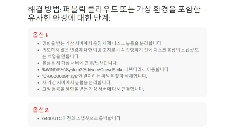 이러한 긴급 상황을 해결하기 위해 크라우드스트라이크가 긴급 복구 방안을 내놨다.