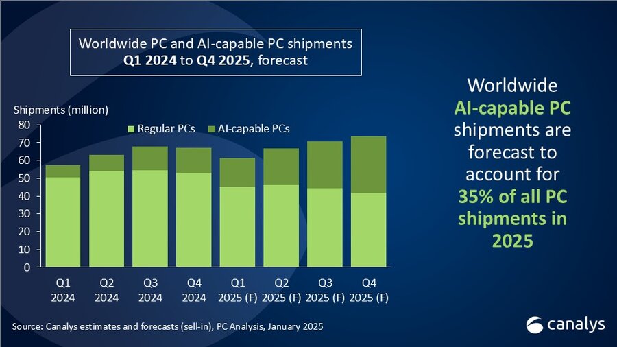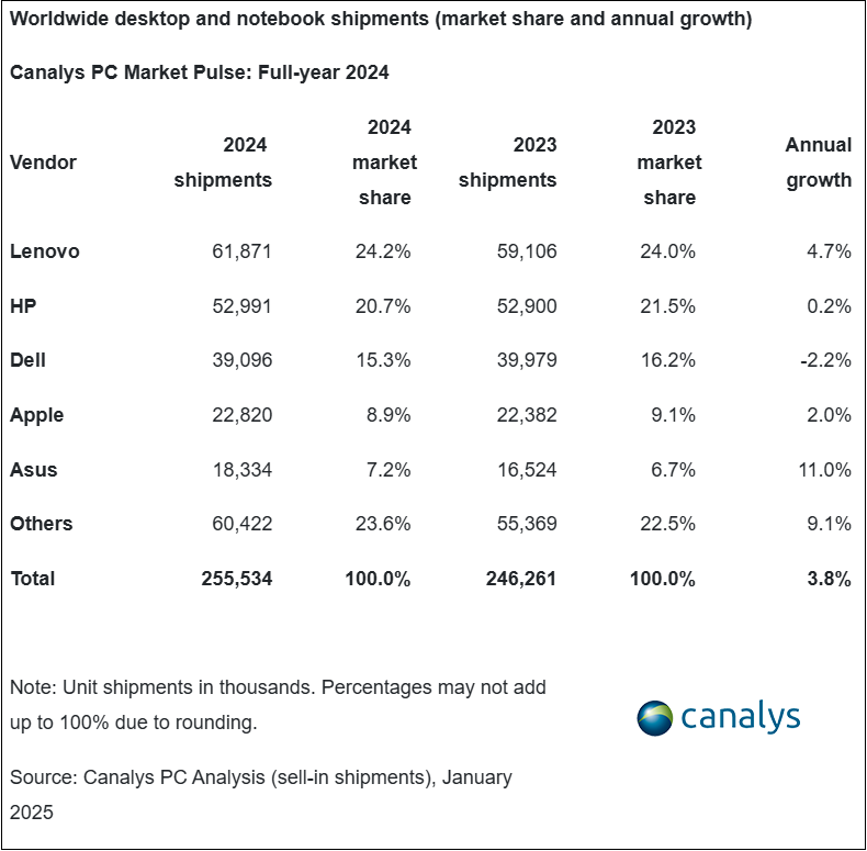 Canalys의 애널리스트인 Kieren Jessop은 “2024년은 완만한 회복세를 보인 한 해였으며 연간 출하량이 3.8% 증가하면서 PC 시장은 전통적인 계절성으로 회귀했다. 4분기 성장률은 소폭 증가했으며, 출하량은 전년동기대비 4.6% 증가했다. 이는 Windows 10 지원 종료일이 1년 이내에 다가옴에 따라 긍정적인 추세를 나타내고 있다”고 말했다.