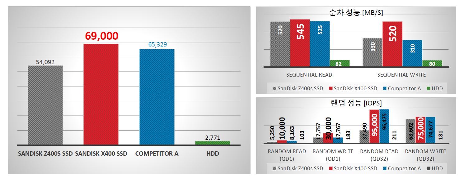 수하스에 의하면 PCMark Vantage 점수로 확인 했을 때 비교적 높은 성능을 제공하는 것으로 나타났다. PCMark Vantage란 사용자 수준의 경험을 나타내는 Benchmark Tool이다. 또한 순차 성능과 랜덤 성능(IOPS)에서도 비교적 높은 성능이 개선되었다고 설명했다.