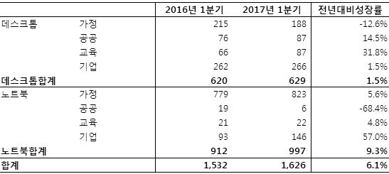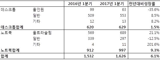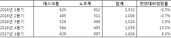 국내 PC 분기별 출하량, 2016년 1분기~2017년 1분기(천대)