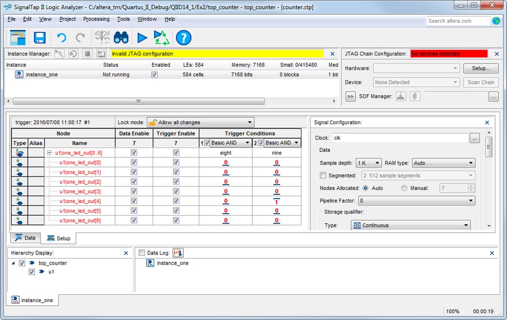‘SignalTap II embedded logic analyzer’의 기능은 미리 정의된 클럭 시그널을 이용해서 내부의 신호를 모니터링 하는 것이다. 실시간으로 다양한 신호를 모니터링할 수 있다. 완성한 custom code에 SignalTap II을 추가하고 목표하는 프로브 포인트를 선택하여 트리거 조건을 잡아 준다. 다음 전체 컴파일하고 결과값을 디바이스에 프로그래밍한다. 분석결과는 SignalTap II의 디버깅 GUI를 통해 볼 수 있다.