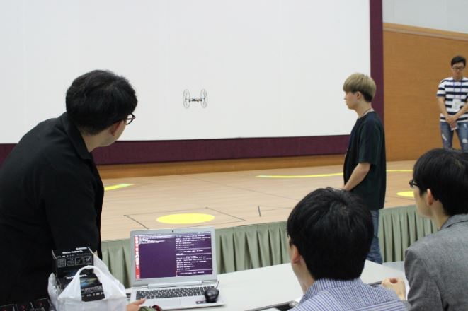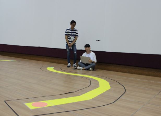 학생들은 심사위원에게 어떻게 프로그램을 구성했는지 설명하고 프로그램을 실행해 드론을 이륙시켰다. 드론을 잘 조종하는 것이 아닌, 바람에 날려 레일을 벗어나도 검정선을 찾아오고, 완주하는 ‘센서 활용 제어’ 알고리즘 구성이 핵심이다. 결과는? 완주한 팀이 없었다.