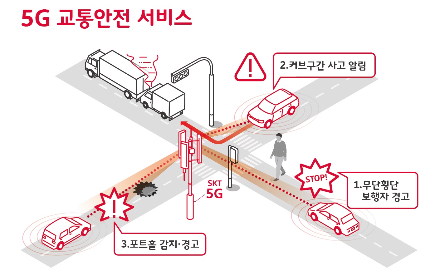 5G 버스와 택시는 정류장, 신호등 등과 수시로 대화하며 데이터를 수집한다. SKT와 서울시는 데이터를 실시간 분석해 위험 상황을 파악 후 5G 차량에 경고를 전달한다. T맵을 통해 일반 차량에도 교통 정보를 전달해 교통 사고를 줄인다.