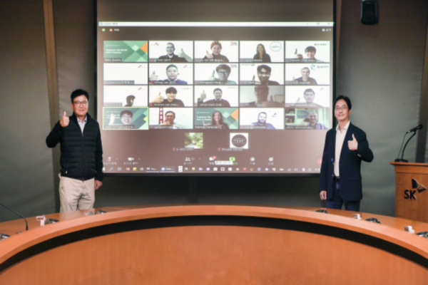 ▲SKT 하영일 센터장이 도이치텔레콤, TIP, 글로벌 통신사 임원들과 언택트 스타트업 육성에 대한 영상회의를 가졌다(왼쪽부터 하형일 SKT코퍼레이트2센터장, 김윤 CTO)[사진=SK텔레콤]