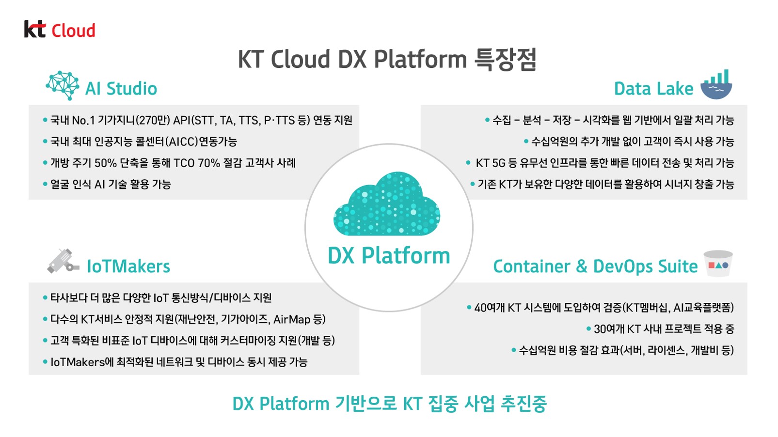 KT가 AI, IoT, 빅데이터, 데브옵스등 다양한 플랫폼을 클라우드로 제공하는 DX 플랫폼을 출시했다. KT DX 플랫폼 이용을 원하는 기업고객은 KT 클라우드 포털에서 서비스 신청 후 즉시 이용이 가능하며, 원하는 기업고객은 전문컨설팅도 받을 수 있다.