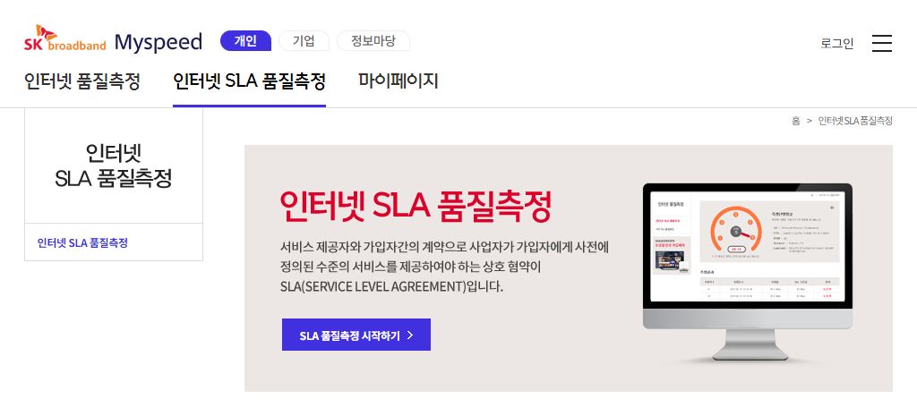 SKT브로드밴드에서는 마이스피드 테스트를 통해 인터넷 SLA 품질 측정이 가능하다. 30분간 5회 이상 측정하여 측정치의 60% 이상이 최저속도(다운로드속도) 미달시 당일 이용요금 감면된다.