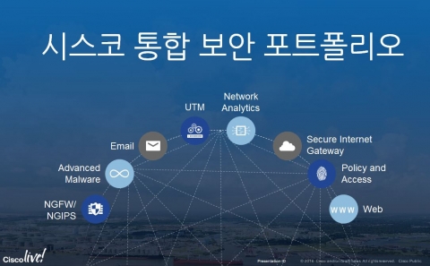 시스코가 미국 라스베이거스(Las Vegas)에서 진행 중인 ‘시스코 라이브 2016(Cisco Live 2016)’ 행사에서, 11일(현지시간 기준), 위협 중심 보안 아키텍처를 토대로 한 클라우드 기반의 시스코 보안 포트폴리오를 발표했다.