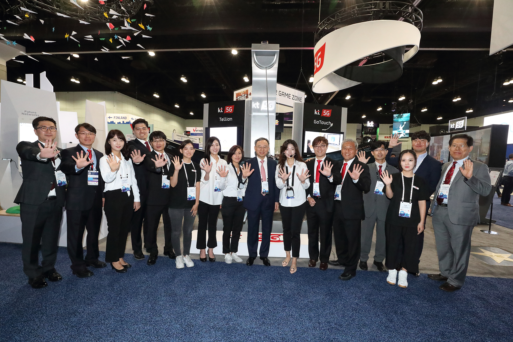 KT 황창규 회장이 KT 전시관에서 임직원들과 기념촬영을 하고 있다