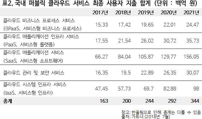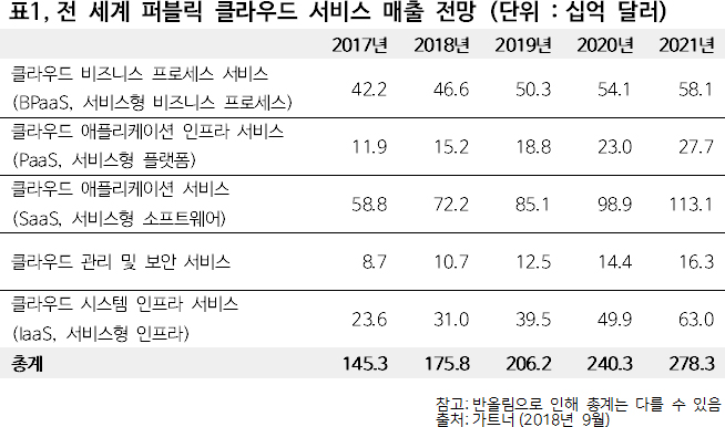 퍼블릭 클라우드 서비스 시장에서 가장 빠르게 성장하고 있는 분야는 클라우드 시스템 인프라 서비스(IaaS)로, 2019년에는 2018년 310억 달러에서 27.6% 증가한 395억 달러에 이를 것으로 전망했다.